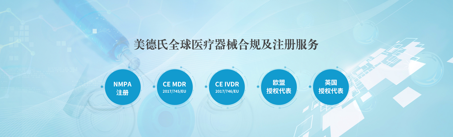 上海美德氏醫(yī)療科技有限公司觸及醫(yī)療行業(yè)熱點(diǎn)需求,提供專業(yè)法規(guī)解讀,專業(yè),誠信,可靠,真正為您的醫(yī)療產(chǎn)品出口的合規(guī)環(huán)節(jié)提供全流程解決方案! 美德氏涉及的服務(wù)包括醫(yī)療器械歐盟CE認(rèn)證咨詢(mdr認(rèn)證;IVDR認(rèn)證),ISO 13485咨詢;美國FDA注冊(cè)(510K;QSR820);歐代美代;國內(nèi)NMPA注冊(cè)咨詢:醫(yī)療器械歐...